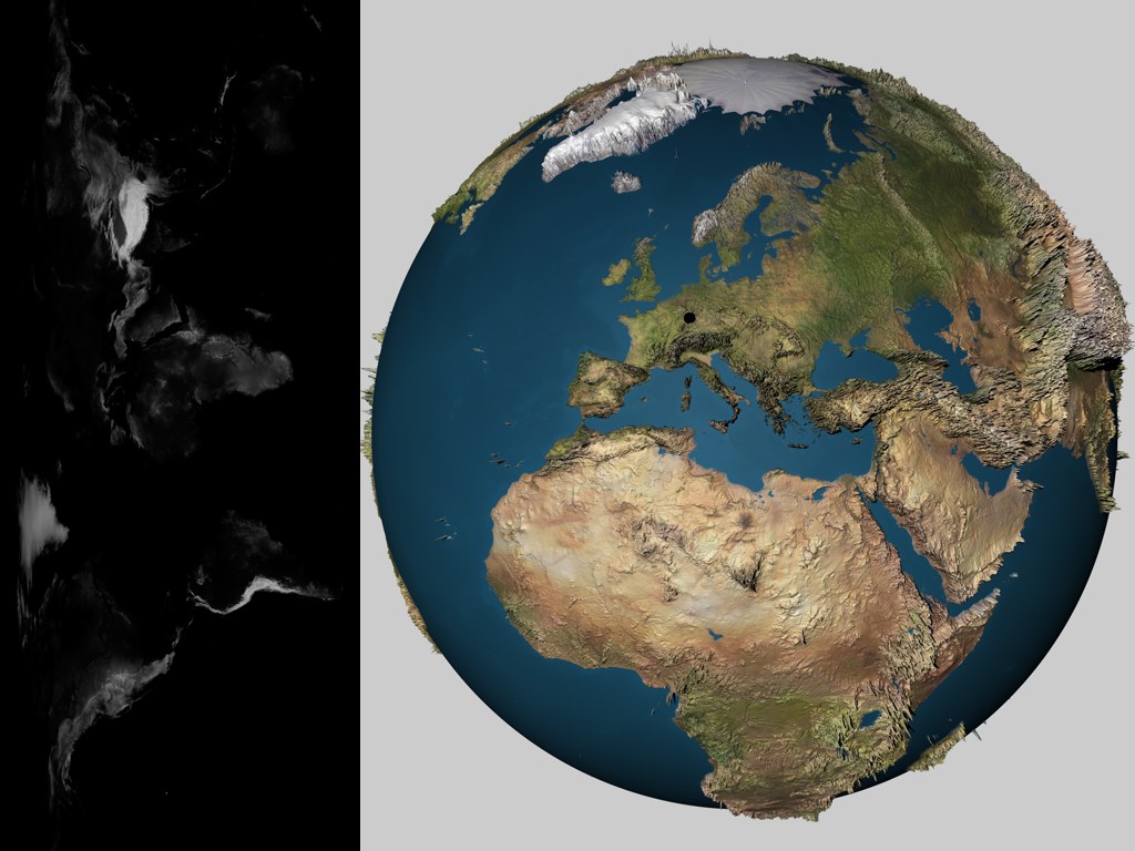 Eclipse solaire à Friedrichsdorf, Allemagne : la texture de déplacement à gauche (la texture couleur n’étant pas présentée) a été utilisée pour le DSP de droite. La hauteur du DSP a été exagérée pour les besoins de l’exemple.