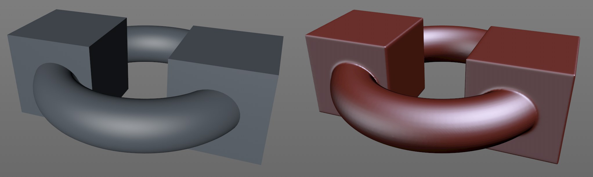 Un tore et deux cubes ont été combinés pour ne former qu’un seul objet, qui peut désormais être modifié à l’aide de la fonction Sculpture (une opération booléenne creuse l’intérieur de tous les objets).