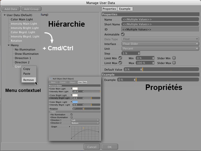 Souvent, des scènes complexes contiennent une grande quantité d’objets. Si de telles scènes sont confiées à d’autres utilisateurs pour modification (ex. création du rig d’un personnage qui a besoin d’être animé), il est utile de créer des données utilisateur qui vont affecter les objets via XPresso (ne paniquez pas, ces expressions sont très simples). Vous retrouverez la scène présentée avec les paramètres qui ont besoin d’être modifiés. Dans la plupart des cas, un objet neutre est créé et se voit assigné unepropriété XPresso dans laquelle les données utilisateur sont enregistrées. Cependant, les données utilisateur peuvent être assignées à un objet et affiché dans le gestionnaire d’attribus. Elles sont enregistrées avec la scène et peuvent être copiées d’une scène à l’autre.