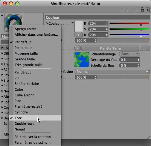 Cette section permet de choisir entre différentes tailles d’aperçu. Le paramètre Par défaut correspond à l’option choisie dans les préférences (Edition / Préférences / matériau).