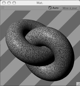 Cette commande ouvre une fenêtre contenant un aperçu du matériau que vous pouvez mettre à l’échelle à votre convenance. La fenêtre est également équipée d’un menu contextuel permettant de choisir la scène utilisée pour l’aperçu (sphère, tore, etc.) et l’animation du matériau. Cochez l’option Auto pour que toutes les modifications apportées au matériau soient mises à jour automatiquement. Lorsque cette option est désactivée, vous pouvez cliquer sur Mise à jour. Vous pouvez également déposer des matériaux et des matières dans cette fenêtre.