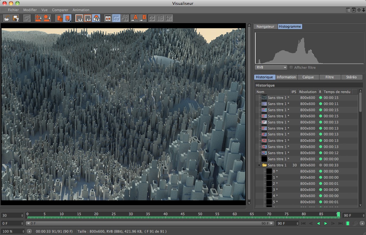 Le Visualiseur est la fenêtre de sortie de Cinema 4D. Le rendu des images ou des animations y est effectué si l’option correspondante est sélectionnée dans les Préférences de rendu (cf. (missing or bad snippet)). Les images rendues lors d’une session donnée peuvent être réouvertes à tout moment depuis l’onglet Historique tant que la session est ouverte.