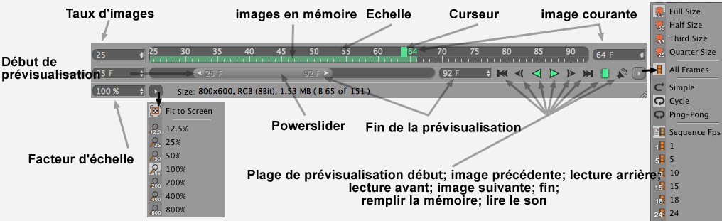 La gamme affichée dans la Ligne temporelle et définie par le Powerslider (”extrait”) sera l’unique gamme d’images jouée. Le Powerslider peut être utilisé pour naviger temporellement à travers votre gamme d’images. Sa longueur ajustable (tirez sur son extrémité droite ou gauche) détermine la gamme d’images du dessus (”extrait”). Vous pouvez double-cliquer sur les numéros d’images situés à l’extrémité droite ou gauche du Powerslider pour rapidement définir manuellement un extrait. Si vous cliquez sur le Powerslider tout en appuyant sur les touches Ctrl + A de votre clavier la longueur du Powerslider se réglera sur l’étendue complète de toutes les images. Si vous appuyez sur la touche Alt tout en tirant, les extrémités du slider seront mises à l’échelle.