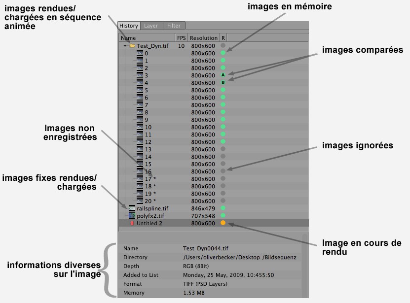 Cliquez sur l’une des entrées de la liste pour qu’elle s’affiche dans le Visualiseur. Les images d’animation seront sauvegardées dans un répertoire nommé d’après le nom de la scène (fraîchement rendue) ou du fichier (images chargées). Les images avec le symbole * accolé à leur nom n’ont pas été enregistrées. Le panneau Historique contient les colonnes suivantes :