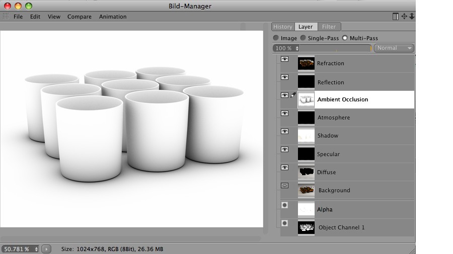 Le mode de l’image passe sur le mode Multi-passes, c’est-à-dire que les modes de fusion et d’intensité de fusion seront inclus dans la passe montrée. Chaque passe peut être cachée (et de nouveau montrée) en cliquant sur l’icône oeil placé sur sa gauche.