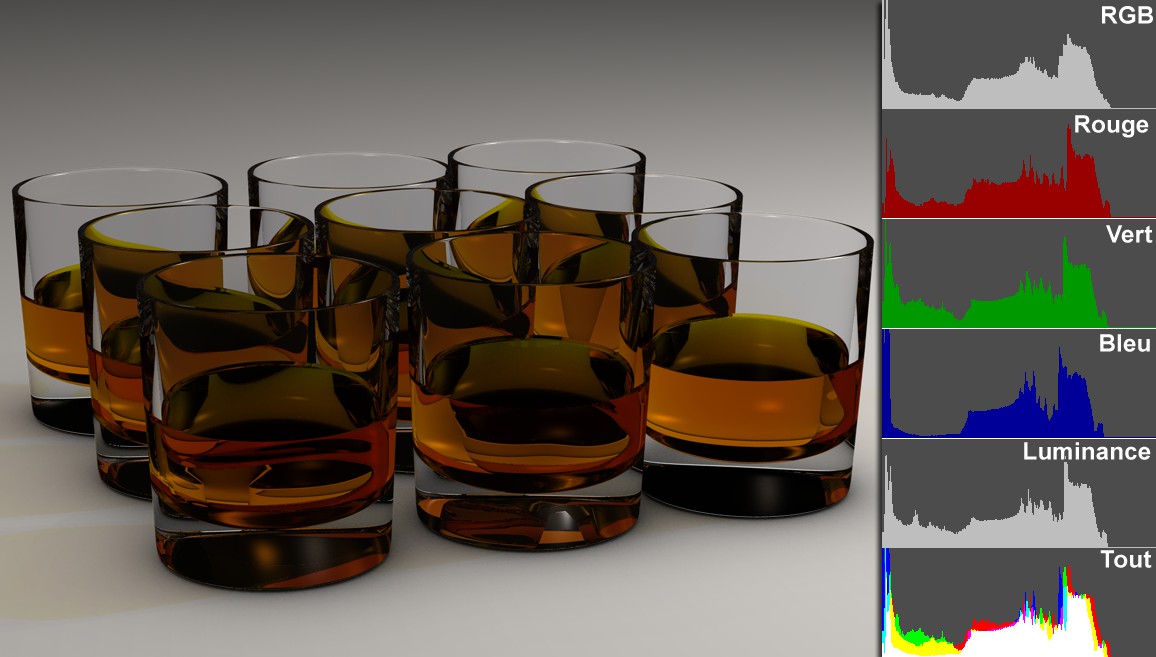 L’Histogramme affiche une dispersion statique d’informations d’intensité, de couleur et de luminescence pour une image (ou canal multi-passes). Les pics de l’Histogramme représentent les valeurs les plus récurrentes. Si vous regardez l’image ci-dessus, vous verrez que l’Histogramme est assez "vide” à droite. Ce n’est pas surprenant car l’image est plutôt foncée et ne contient pratiquement aucune zone blanche. Par exemple, si vous regardez l’Histogramme, vous pouvez rapidement dire si une image est surexposée ou si son contraste est correct.