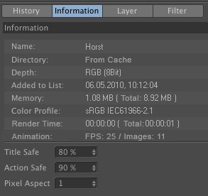 Vous trouverez ici plusieurs informations évidentes concernant l’image sélectionnée. Pour les images et les séquences dont le rendu vient d’être fait, le temps de rendu par image et le temps de rendu total seront affichés.