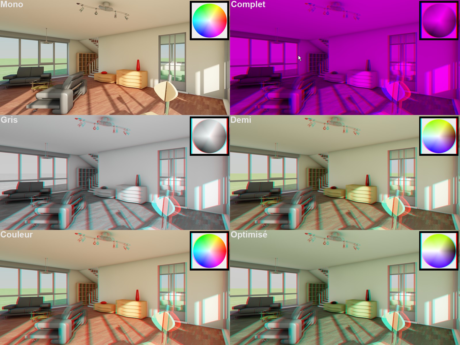 Les différentes méthodes disponibles (mode Complet avec un anaglyphe de couleurs rouge et bleue). Modèles de DOSCH Design.