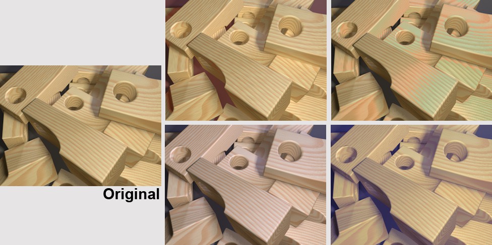 Ces modes ne permettent qu'une reproduction limitée des couleurs par rapport aux options précédemment décrites. Le bleu, le vert et le jaune peuvent être très bien reproduits lorsque le code classique rouge-cyan est appliqué. Si le mode Couleur est sélectionné, une "rivalité rétinienne" peut survenir. Les surfaces rouges (rouge-cyan) obligeront l'oeil gauche à transmettre au maximum l'intensité de la couleur au cerveau, et l'oeil droit ne verra que du "noir". C'est très irritant et fatigant pour les yeux (vous pouvez le constater sur le vase rouge de l'image ci-dessus). Cet effet peut être minimiser en sélectionnant le mode Demie couleur. Cependant, le rouge sera alors assombri à tel point qu'il sera difficile de distinguer que c'est du rouge.