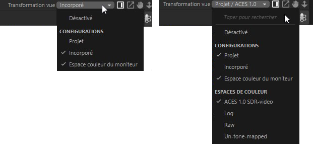 Sur le côté droit de l'image, vous pouvez voir le menu complet si la configuration Gestion des couleurs OCIO avec ACES est active. Vous aurez accès aux espaces couleurs disponibles pour la transformation de l'espace de vue.