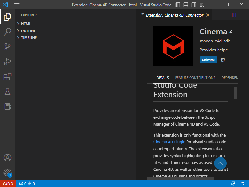 Dès que l'extension Visual Studio Code est installée dans Visual Studio Code, vous devriez voir une boîte rouge avec "C4D X" en bas à gauche de la fenêtre dans la barre d'état. Lorsque vous cliquez dessus, une connexion avec l'échangeur de code précédemment activé dans Cinema 4D est automatiquement établie, de sorte que la couleur de la case dans la barre d'état standard change.