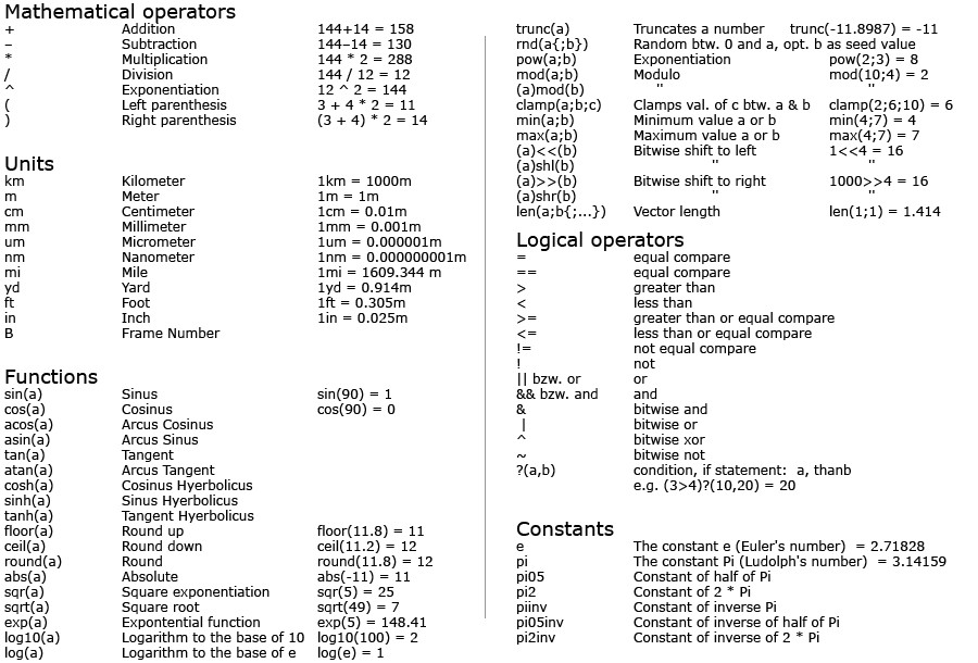 L’analyseur de fonction intègre les opérateurs arithmétiques les plus importants. Il est possible de combiner librement plusieurs opérations, par exemple : 2 km + exp(sin(4 mm*pi)) / ((sin(14 cm))^2 + (cos(14 cm))^2).