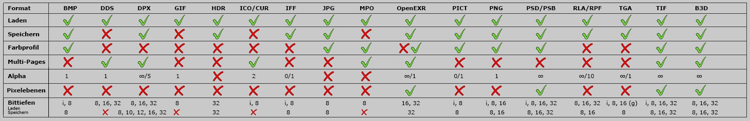 Les différents formats d’image et leurs propriétés. Multi-Pages n’est disponible que pour l’importation. Si vous pouvez choisir plusieurs entrées, celles-ci servent au chargement et à la sauvegarde. i représente les couleurs indexées (profondeur de bits).