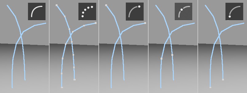 Modes de gauche à droite : Guides, Points, Pointes, Points d’ancrage, Racines.