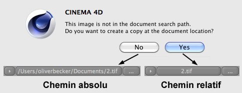 Si vous sélectionnez Non, le "chemin d’accès” à la texture sera sauvegardé comme un chemin d’accès absolu, c’est-à-dire qu’il sera le chemin d’accès du répertoire dans lequel CINEMA 4D cherchera la texture pour le rendu. Cela peut toutefois se révéler problématique lorsque le fichier scène est transféré, par exemple à un autre infographiste : vous ne pourrez pas trouver la texture sur un autre ordinateur. Dans la plupart des cas, il est préférable d’utiliser des chemins d’accès relatifs (via la commande
