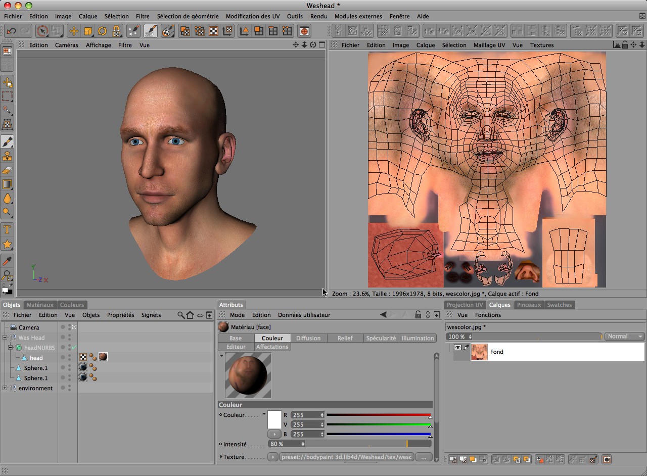 Avant de pouvoir modifier les UV, vous devez toutefois vous assurer que l'objet dispose bien de coordonnées UV (BodyPaint 3D peut générer ces coordonnées si nécessaire). De plus, la texture de l'objet doit utiliser la projection UVW.
