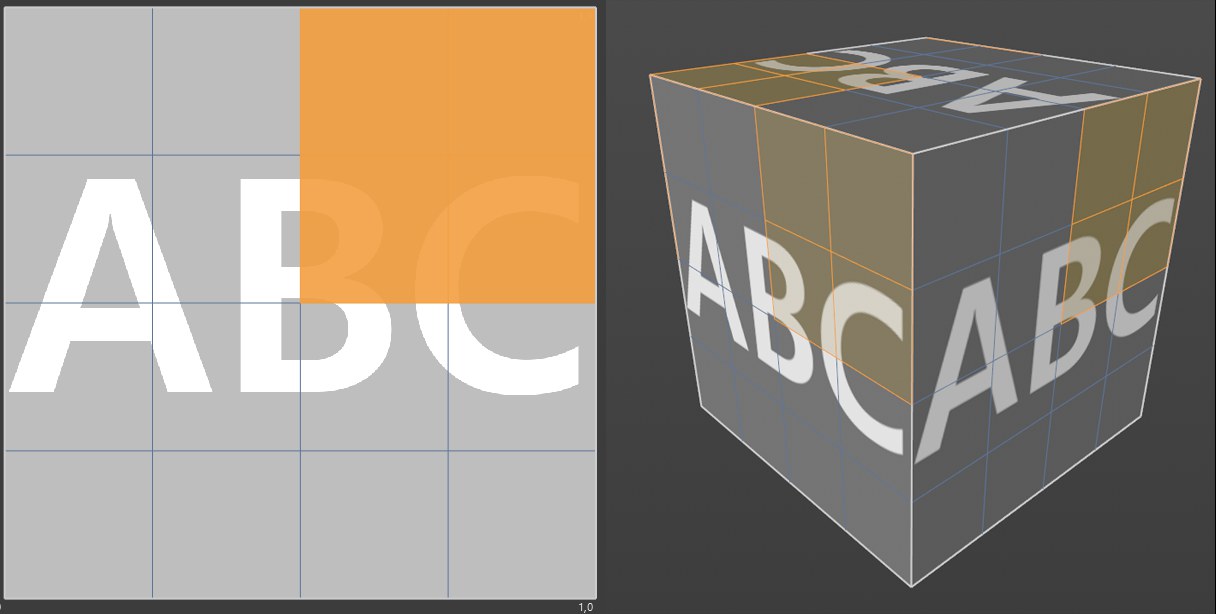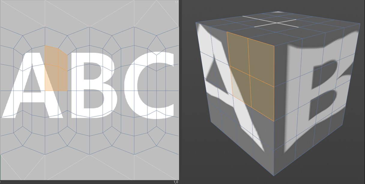 Vous pouvez voir à la Figure 2 (projection cubique) qu'il n'y a aucun polygone UV séparé ; les côtés ne peuvent pas être peints séparément, la texture ayant été appliquée six fois, une fois sur chaque côté. Les traits de pinceau appliqués sur un côté sont automatiquement appliqués sur les autres côtés.