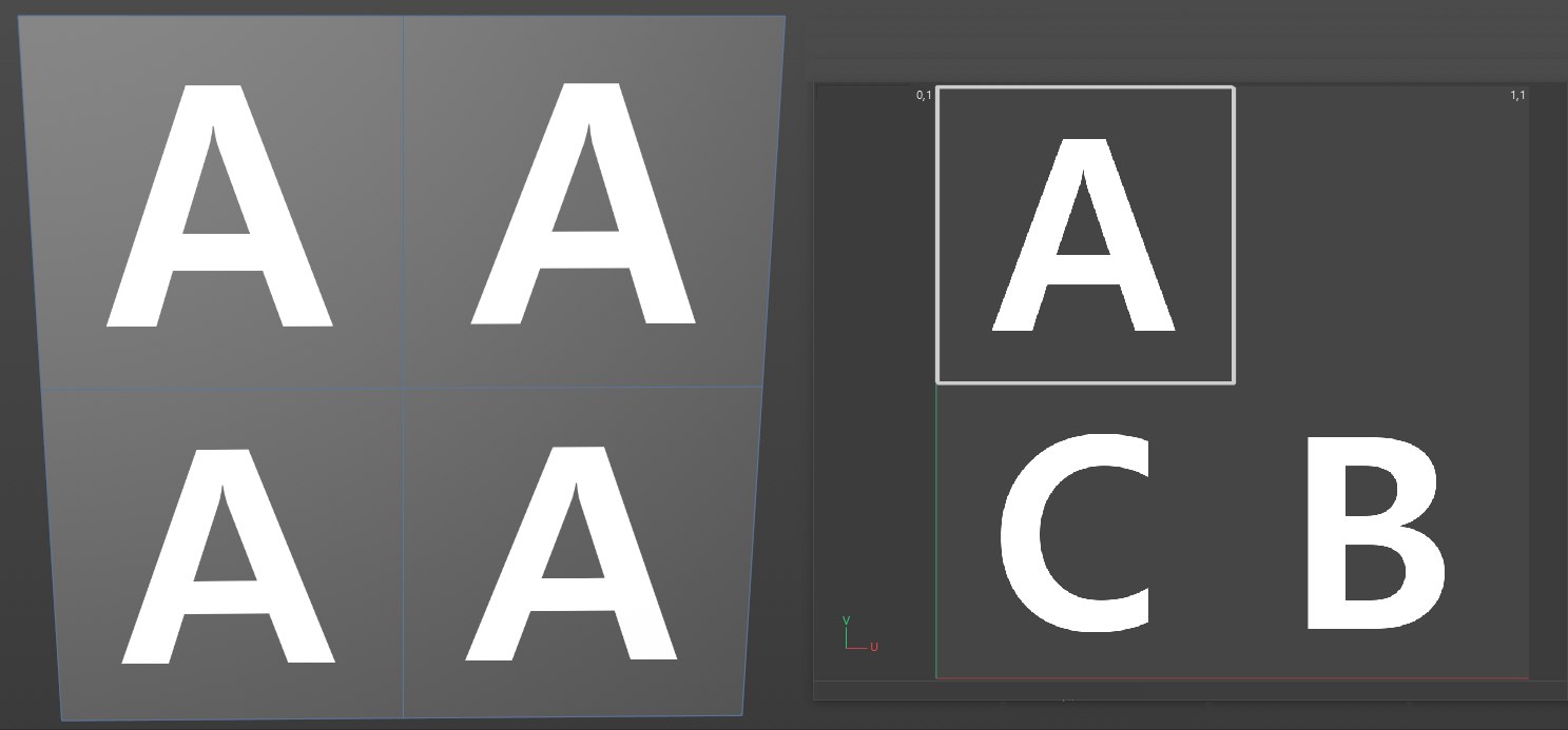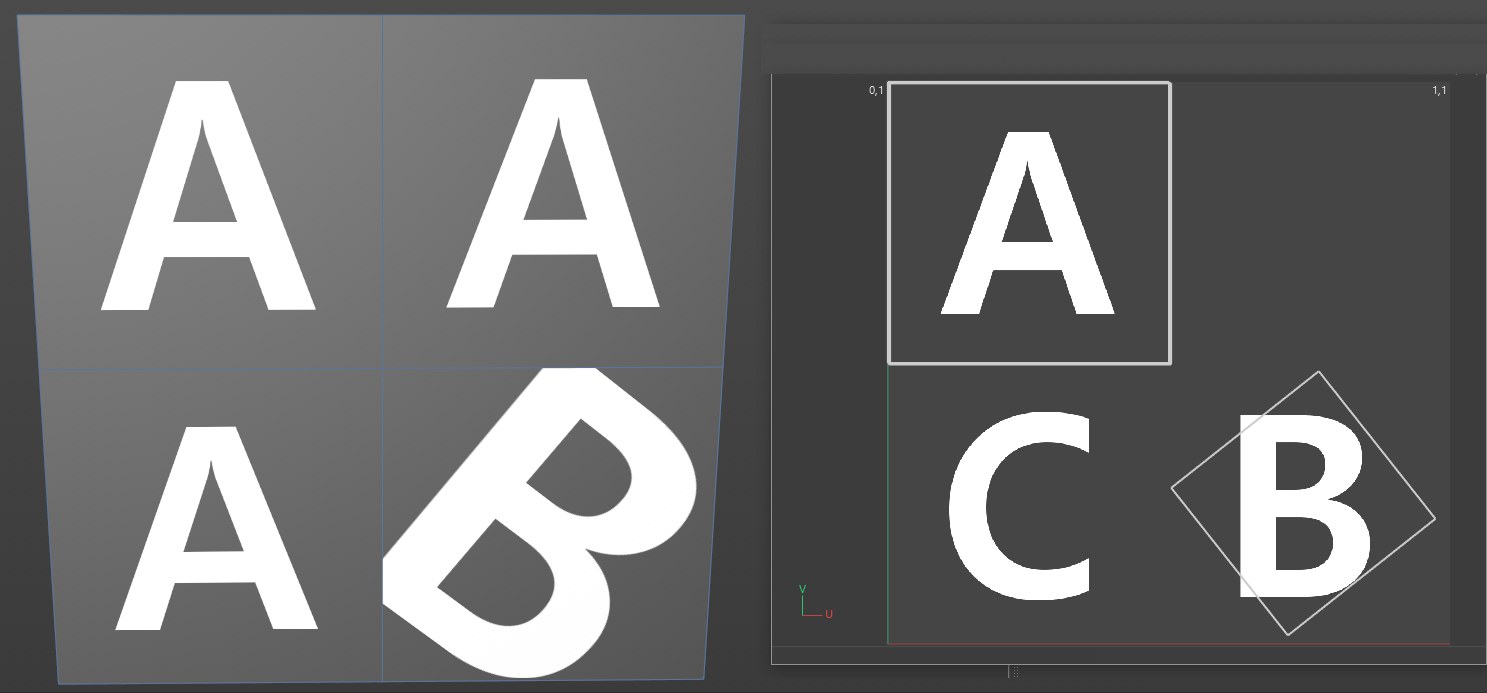 Tous les polygones UV se trouvent au-dessus du A. Si, par exemple, vous déplacez un polygone au-dessus du B, puis le faites pivoter et le réduisez, vous obtiendrez le résultat suivant