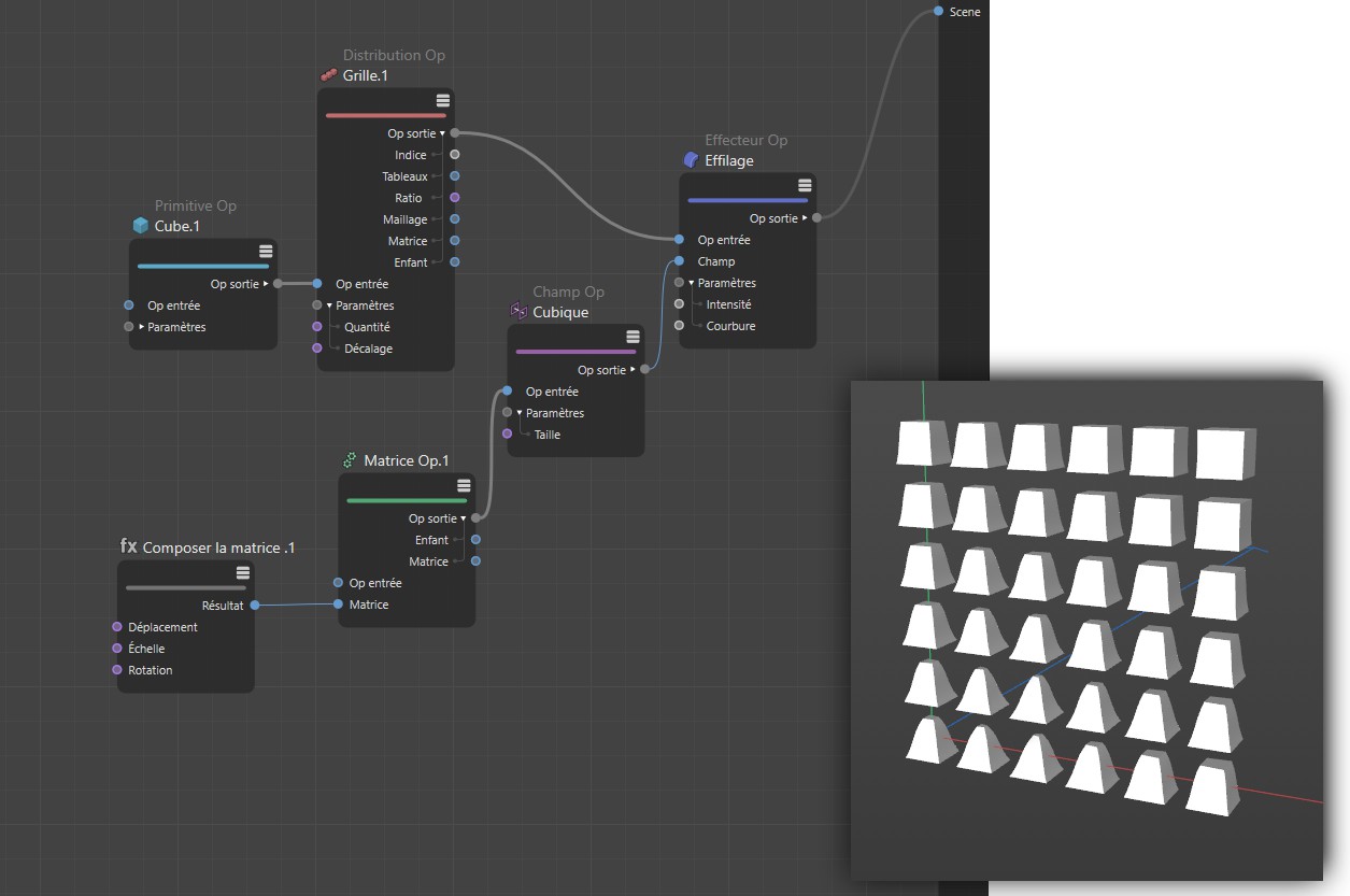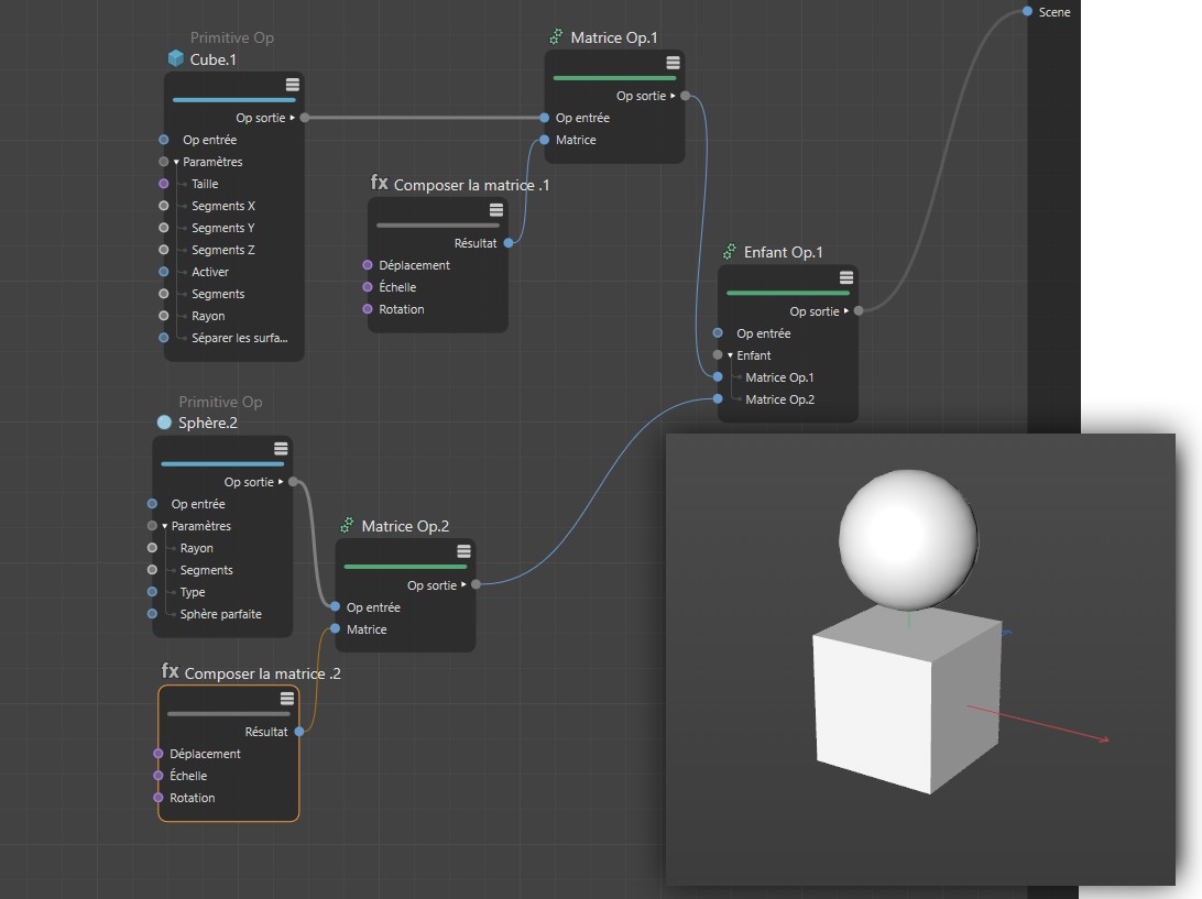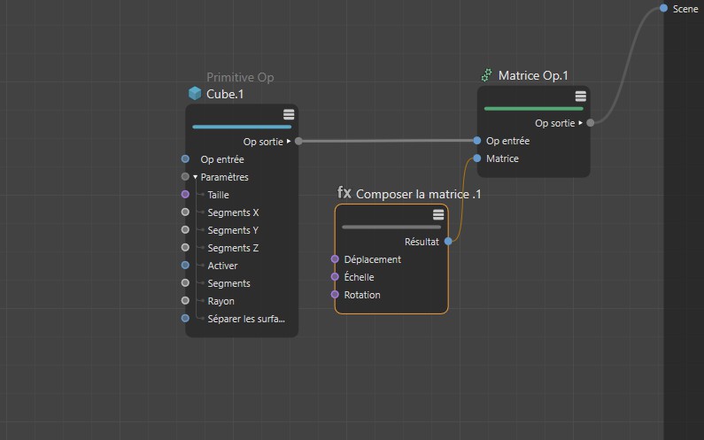 Un nœud Primitive est utilisé pour générer un cube. Cette sortie du nœud peut être connectée directement avec la racine de Scène, mais nous allons ajouter d'abord notre propre matrice, afin de pouvoir contrôler la position, l'échelle et la rotation de notre cube comme nous le voulons . La sortie du nœud Op matrice contient des informations relatives à la position du cube et peut être envoyée à la scène. Le cube apparaitra alors à la position définie avec la rotation respective dans la vue. Alternativement, nous pourrions utiliser le noeud "Primitive" lui même qui possède une matrice pour le déplacement, la rotation et la mise à l'échelle.