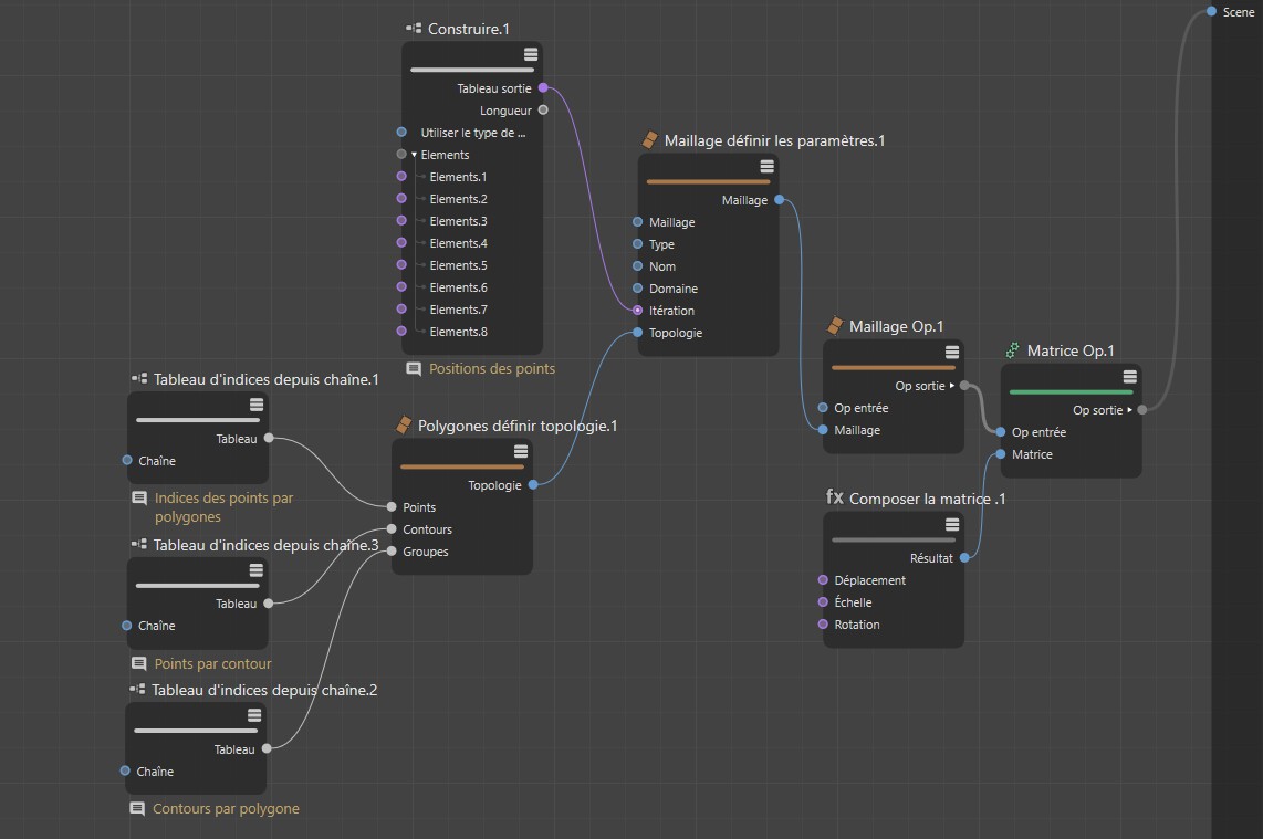 Le nœud de réglage de la typologie des polygones peut être utilisé pour régler les numéros des points appartenant à un polygone donné. Comme cette série de nombres ne comprend aucune information indiquant, par exemple, si les polygones doivent être créés sous forme de triangles ou de quads, vous devrez ajouter une répartition contenant le nombre de points pour chaque polygone doté d’arêtes continues. Ces informations seront nommées Côté dans le nœud. Finalement, les informations concernant le nombre de côtés que comprend le polygone, sont manquantes. Normalement il ne s’agira que d’un côté mais les N-Gones à trou peuvent, bien sûr, également être générés. Dans ce cas, un côté pour la forme externe du n-gone et un côté pour l’ouverture seront définis. Ces informations seront nommées Groupes dans le nœud. Les informations relatives aux indices point, aux côtés et aux groupes sont collectivement appelées Topologie et peuvent être combinées pour former un maillage via le nœud Configurer propriété maillage. Pour ce faire, la position de tous les points doit être configurée. Pour cela, une répartition sera de nouveau requise qui sera définie via le nœud Construction comme illustré dans l’image ci-dessous.