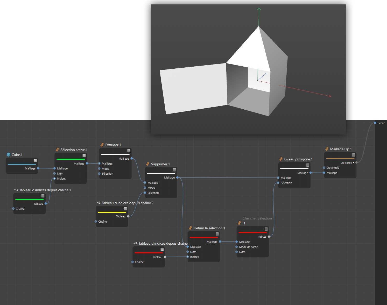 Les nœuds marqués en vert utilisent une liste d’indices de points pour créer une sélection d’arête, qui sera ensuite extrudée.