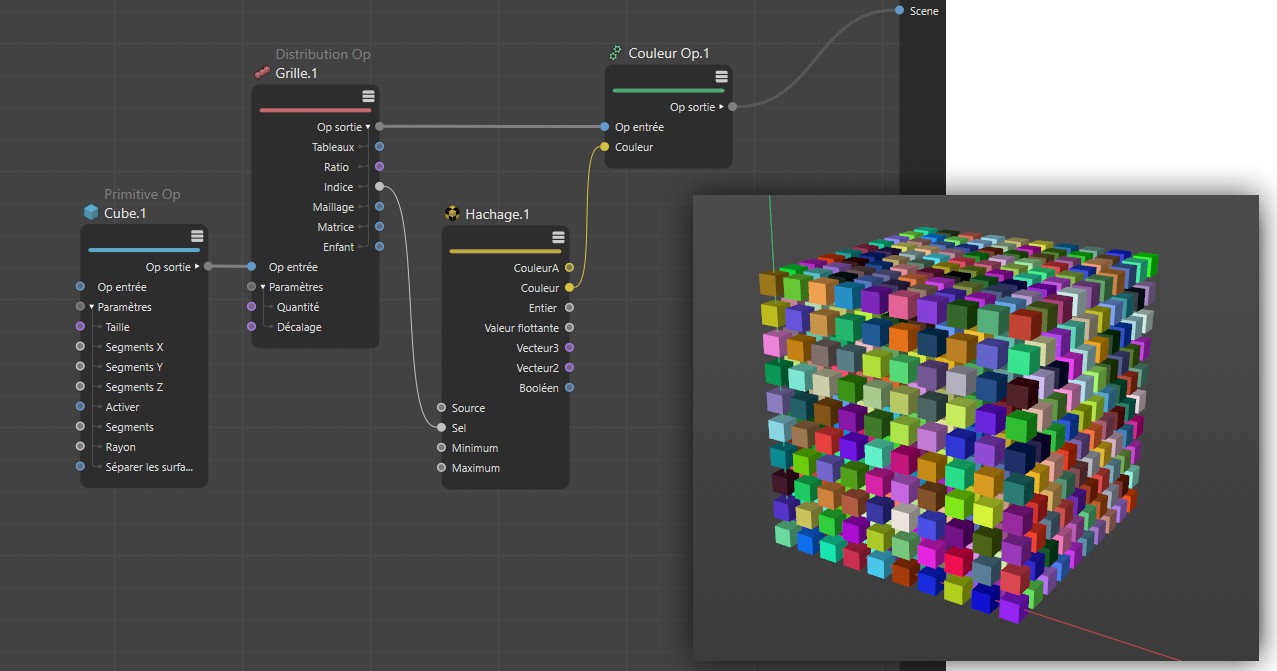 Si vous souhaitez dupliquer des objets, vous pouvez, par exemple, utiliser un nœud Op distribution, qui peut être utilisé de manière similaire à l’objet cloneur de MoGraph. Un objet lié sera cloné aux positions définies et peut être envoyé directement dans la scène. Le nœud Op couleur peut être utilisé pour colorer ces clones individuellement. Dans l’image d’exemple ci-dessous, un nœud hachage a été utilisé pour générer aléatoirement des couleurs.