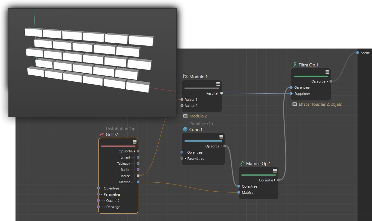 Dans cet exemple, vous constatez également de quelle manière les objets issus d’une distribution peuvent être supprimés. Ici, un modulo mathématique avec une valeur de 2 pour les nombres indice de clones est utilisé pour ne délivrer que des résultats compris entre 0 et 1. Ces valeurs peuvent être interprétés comme des valeurs booléennes via un nœud Op filtre, ce qui donnera lieu à la suppression automatique de tout autre objet. Le résultat sera un modèle de ruche ou de brique typique.