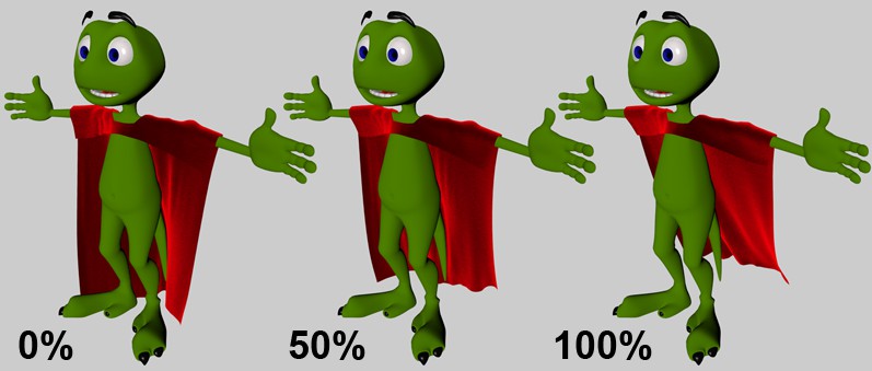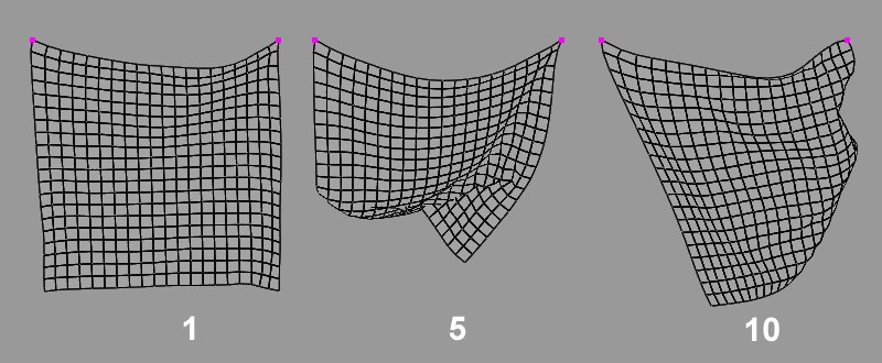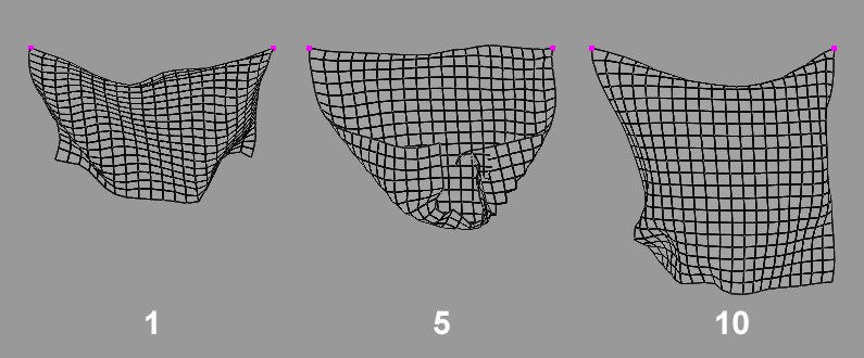 Cette option peut s’avérer très pratique dans des situations de mouvements très complexes exécutés par un personnage ou un objet, si le Tissu doit se stabiliser pendant quelques images. Ce paramètre peut être animé. Si vous augmentez la valeur de 100% pour les images, le Tissu peut se stabiliser pendant ces moments de mouvements intenses.