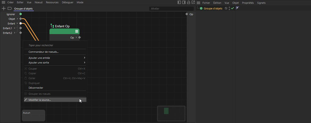 Pour les étapes suivantes, il est préférable de passer à l'interface Nodes dans Cinema 4D et d'ouvrir le navigateur de ressources. Naviguez jusqu'au groupe Construction de ressources et localisez le Groupe d'objets. Celui-ci sert généralement de base aux générateurs qui fonctionnent également dans le gestionnaire d'objets où ils peuvent, par exemple, être combinés avec des objets normaux. Faites glisser le groupe d'objets du navigateur de ressources vers le gestionnaire d'objets. Le mode Capsule sera automatiquement activé dans l'éditeur de nœuds où le groupe d'objets encore vide sera affiché, comme indiqué ci-dessous.
