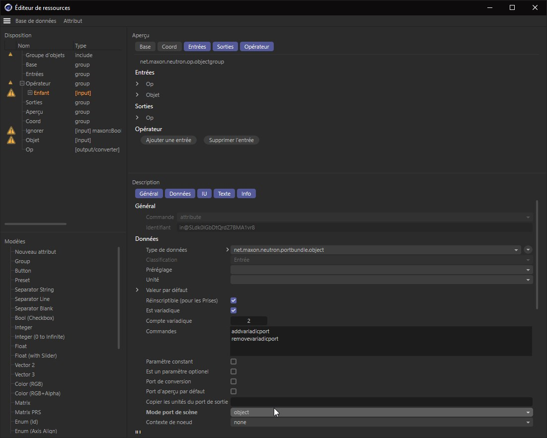 En haut de l'éditeur de ressources, dans la zone Disposition, vous verrez une liste des entrées et sorties existantes du groupe d'objets. Sélectionnez l'entrée Enfant que nous avons créé précédemment. En bas à droite de l'éditeur de ressources, vous verrez l'onglet Description/Données où vous devez définir le mode de port de scène sur Objet .