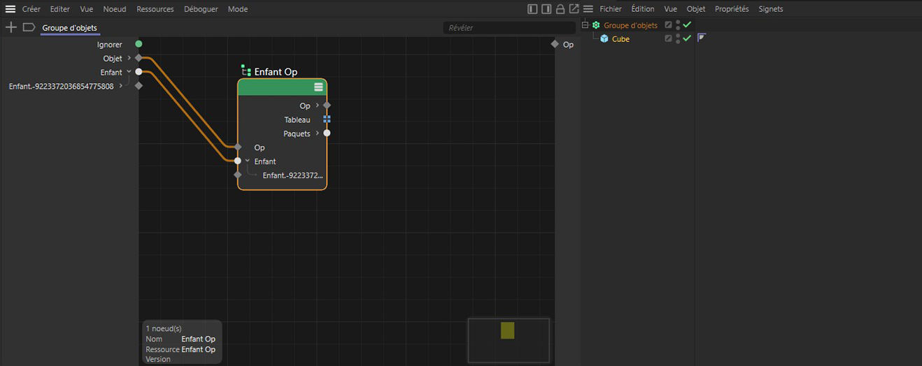 Afin de tester ces modes améliorés dans les étapes suivantes, nous devons d'abord faire d'un objet un objet Enfant du groupe d'objets Capsule dans le gestionnaire d'objets. Comme cet objet ne sera pas visible plus tard, sa forme et sa taille sont secondaires. Comme vous pouvez le voir dans l'image ci-dessous, un cube a été transformé en objet Enfant de la Capsule dans le Gestionnaire d'objets. Le nœud Enfant Op met à disposition une sortie Tableau, qui nous donne accès à tous les objets Enfant.