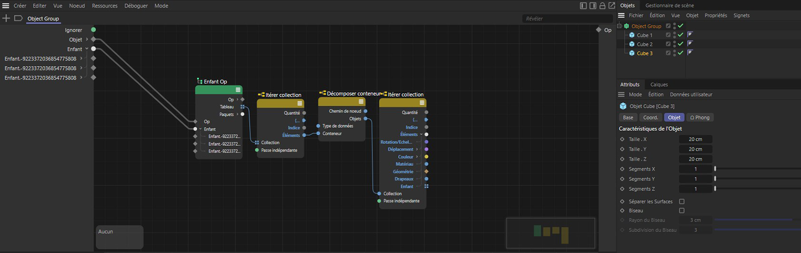 En faisant d'une primitive paramétrique un objet Enfant d'un groupe d'objets dans le gestionnaire d'objets, le nœud Enfant Op sera activé et rendra une sortie Tableau disponible pour ces objets..