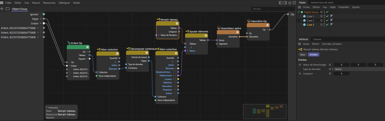 Maintenant, vous pouvez réellement commencer à modifier ces données et pouvez, par exemple, utiliser les objets Enfant pour créer de nouvelles formes. Dans cet exemple, les positions des objets Enfant doivent être transformées en points le long d'une spline linéaire. Pour ce faire, nous allons d'abord utiliser un nœud Remplir Tableau dont le type de données est défini sur Vecteur et la longueur sur 0 pour créer un tableau vide pour les vecteurs. Ce tableau sera ensuite rempli avec les positions des objets Enfant.