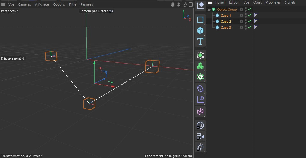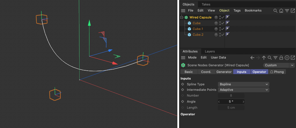 L'utilisation de la ressource. dans le gestionnaire d'objets offre un nouveau type d'objet générateur, qui crée une spline à partir des positions d'objets polygonaux groupés. Dans ce cas, nous avons utilisé une interpolation Bspline pour créer une courbe arrondie entre les trois cubes.