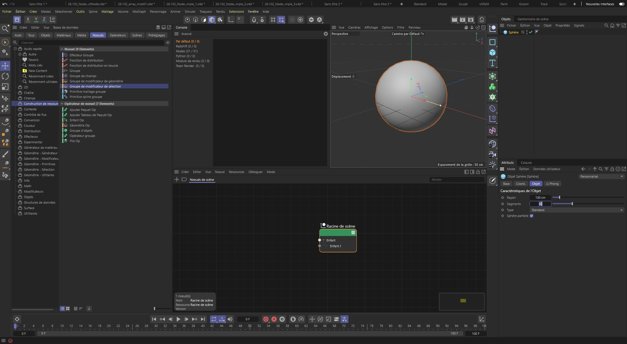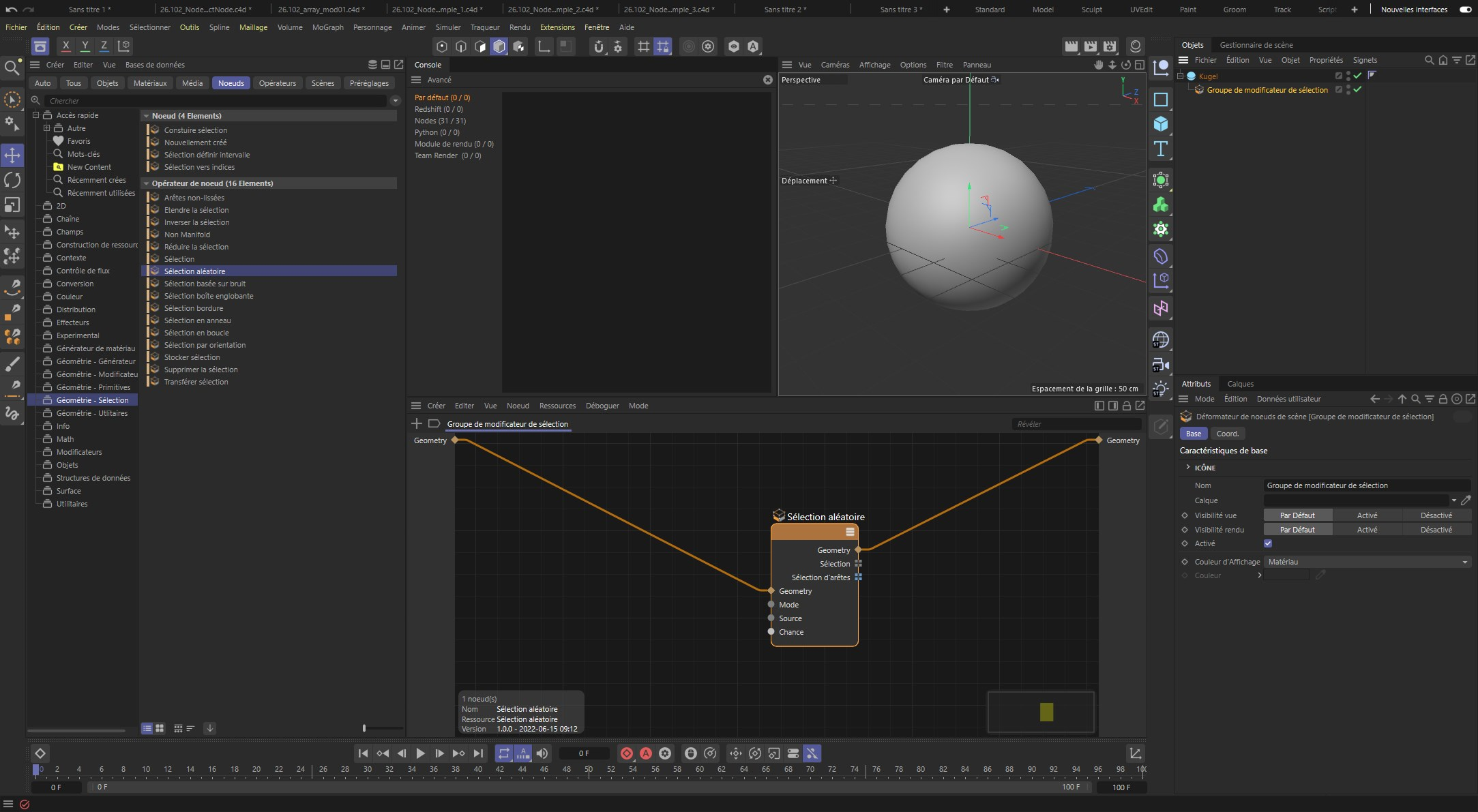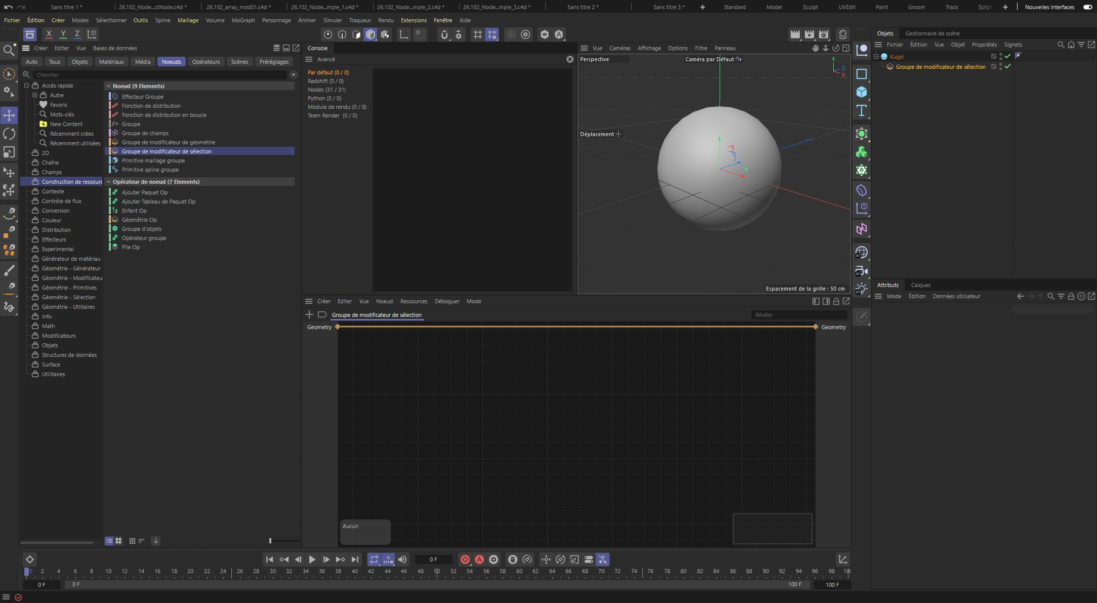 Faites glisser un groupe de modificateurs de sélection depuis le navigateur de ressources vers le gestionnaire d'objets et faites-en un objet enfant de la sphère. L'Éditeur de nœuds passera automatiquement en mode Capsule. Maintenant, nous pouvons, par exemple, utiliser les nœuds du groupe de sélection de géométrie dans l'éditeur de nœuds.