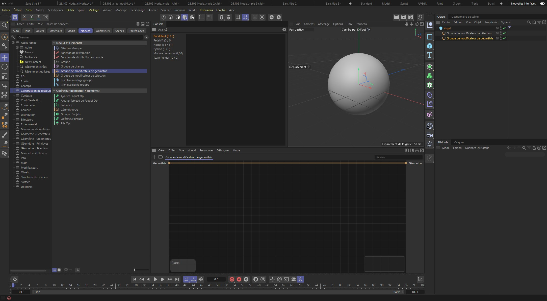 Faites glisser le groupe de modificateurs de géométrie depuis le nœud de construction de ressources vers le navigateur de ressources et faites-en un objet enfant de la sphère dans le gestionnaire d'objets. Il doit être disposé comme second objet Enfant sous la sphère afin que les commandes de modélisation puissent être affectées par la sélection aléatoire..