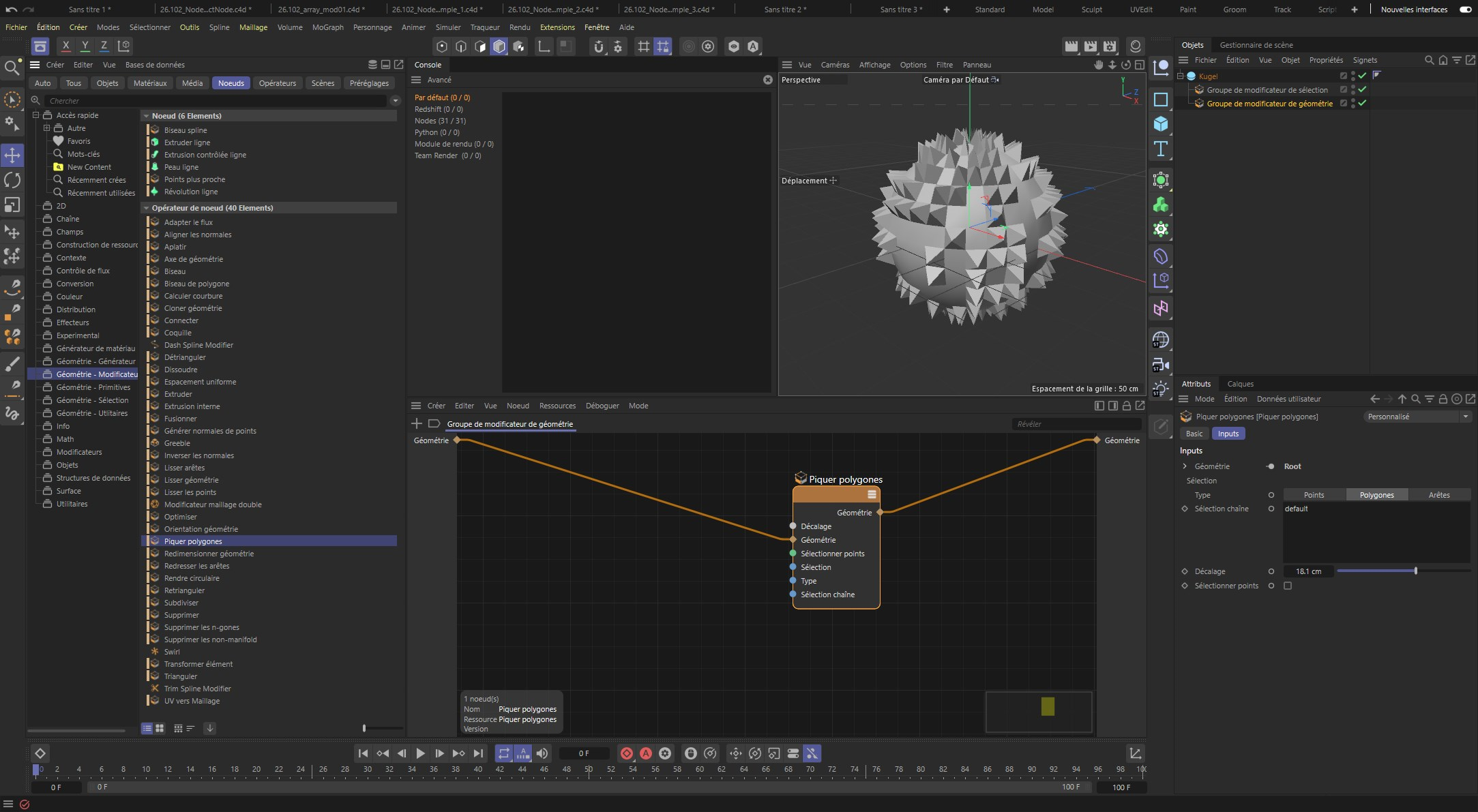 Dans l'éditeur de nœuds, le groupe de modificateurs de géométrie actuellement vide s'affiche. Faites glisser le nœud Piquer Polygones, par exemple, dans l'éditeur de nœuds et connectez à nouveau les entrées et sorties de la géométrie. Si vous saisissez différentes valeurs de décalage pour le nœud dans le gestionnaire d'attributs, vous pouvez voir l'effet qu'il a sur la sphère dans la fenêtre d'affichage. Les polygones sélectionnés au hasard se transforment en formes d'entonnoir ou de pyramide, en fonction de la valeur de décalage définie..