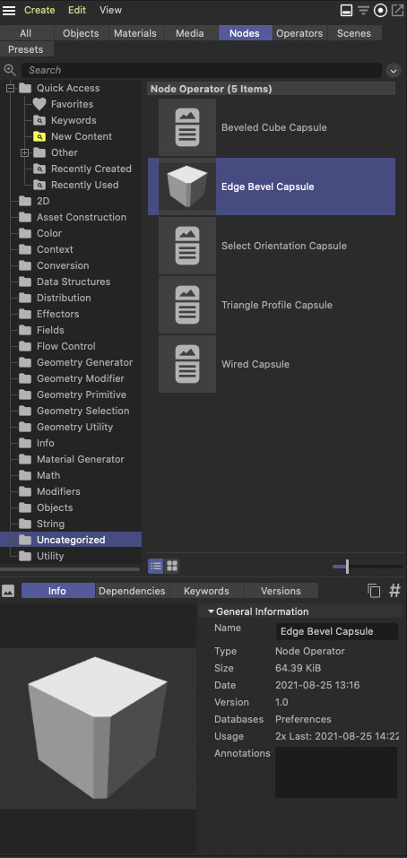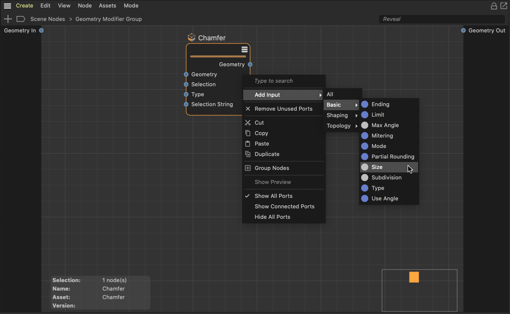 Voyons cela en utilisant une simple fonction de modélisation à titre d'exemple. Ces étapes peuvent ensuite être appliquées à toutes les autres ressources et ressources Capsules. Pour ce faire, créez un "groupe de modificateur de géométrie" et ouvrez-le en cliquant sur son icône de dossier dans l'en-tête. Choisissez maintenant une commande de modélisation simple, telle que le nœud "Biseau", et faites-le glisser du navigateur de ressources vers le groupe. Ce nœud offre deux modes. Ici, nous optons pour le paramètre "Type" "Arêtes" pour arrondir les arêtes.