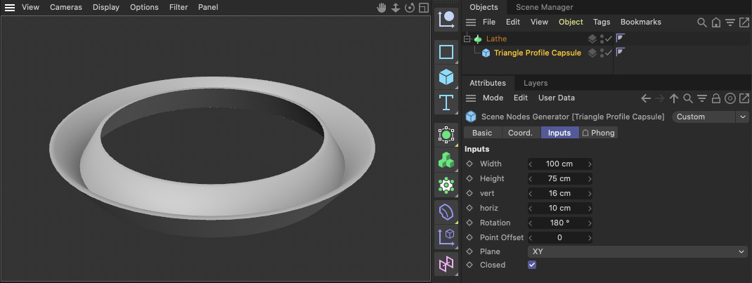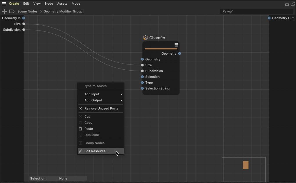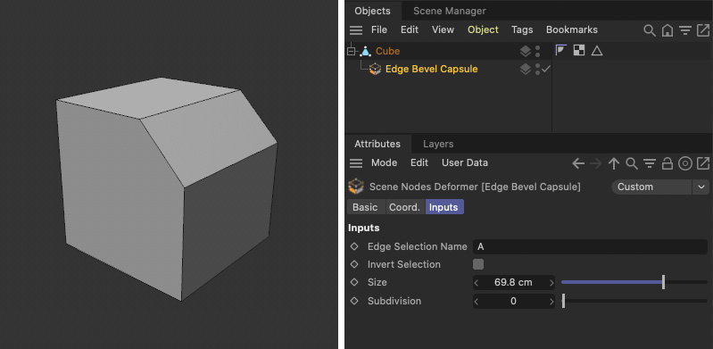Lorsque vous créez de nouvelles méthodes de modélisation ou de sélection, il peut être utile de pouvoir les tester directement dans le gestionnaire d'objets pendant leur création. L'éditeur de nœuds offre un mode spécial Capsule dans le menu Mode. Ce mode sera activé automatiquement si, par exemple, un groupe de modificateurs de géométrie ou un groupe de primitives de maillage est glissé du nœud de construction de ressources directement dans le gestionnaire d'objets. Jetons un coup d'oeil à l'exemple ci-dessous.