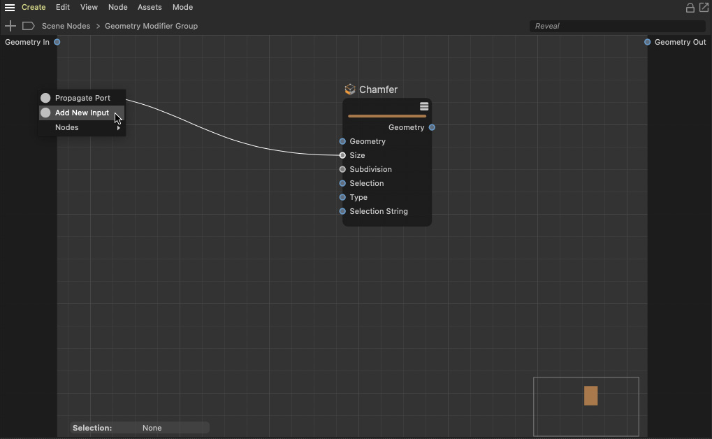 En faisant glisser un port d'entrée d'un nœud vers le côté gauche du groupe, vous pouvez ajouter ce paramètre comme entrée au groupe en choisissant "Ajouter une nouvelle entrée" dans le menu contextuel.