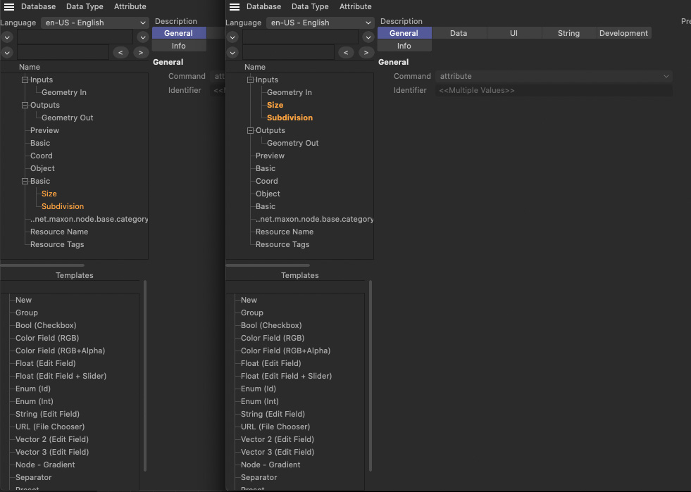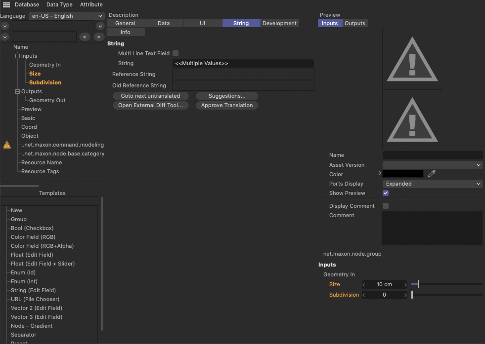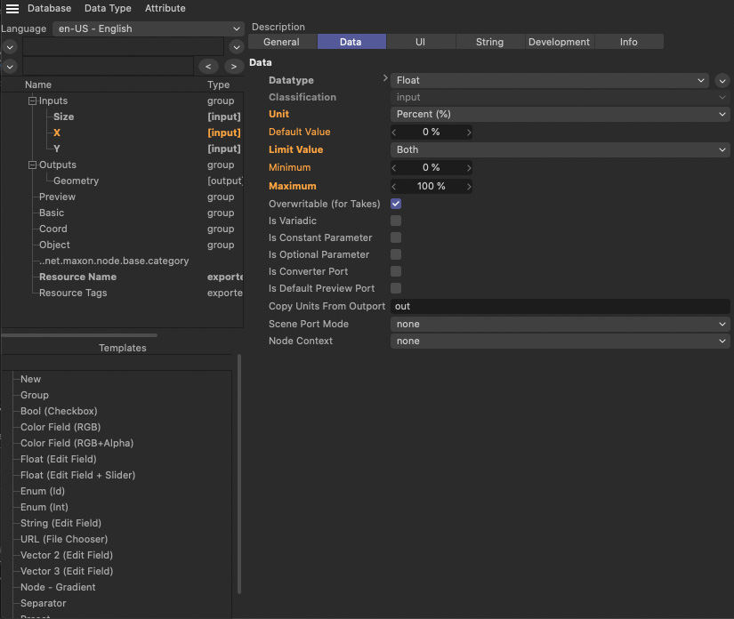 La deuxième option est disponible via l'"Éditeur de ressources". Pour ce faire, cliquez avec le bouton droit de la souris dans le groupe ouvert ou sur le groupe de noeud lui-même et sélectionnez " Editer la ressource " dans le menu contextuel. L'éditeur de ressources s'ouvre, où vous pouvez créer vos propres ports, sélectionner les types de données et modifier les noms. Cette option est également utile si vous souhaitez rendre plusieurs paramètres disponibles en tant qu'entrées et modifier leurs réglages dans une interface individuelle. L'éditeur de ressources propose également déjà des types de données et des éléments de contrôle typiques dans la colonne inférieure gauche en tant que préréglages, qui peuvent être glissés directement dans la liste des entrées et des sorties ci-dessus. Les contrôles, les valeurs par défaut et les noms des ports sélectionnés peuvent ensuite être modifiés dans la colonne centrale de l'éditeur, ainsi que de nombreux autres paramètres.