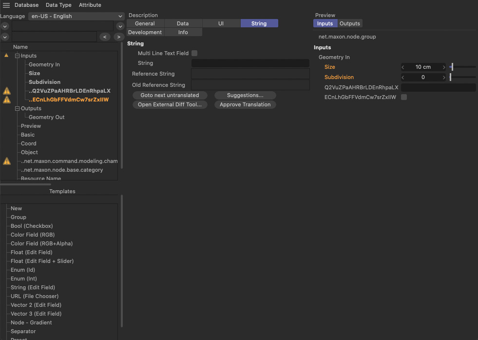 Que diriez-vous de donner à l'utilisateur d'autres options de réglage, comme une option d'entrée pour le nom d'une sélection d'arêtes enregistrée, afin de pouvoir restreindre la commande de modélisation aux seules arêtes sélectionnées ? En outre, une fonction d'inversion pour la sélection spécifiée pourrait également être utile pour arrondir tous les arêtes sauf celles qui se trouvent dans la sélection spécifiée. Pour ce faire, nous aurions besoin d'un champ de saisie de type chaîne et d'une option booléenne comme entrées. Nous les créons via l'éditeur de ressources.