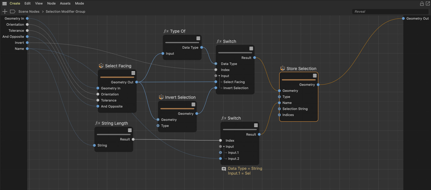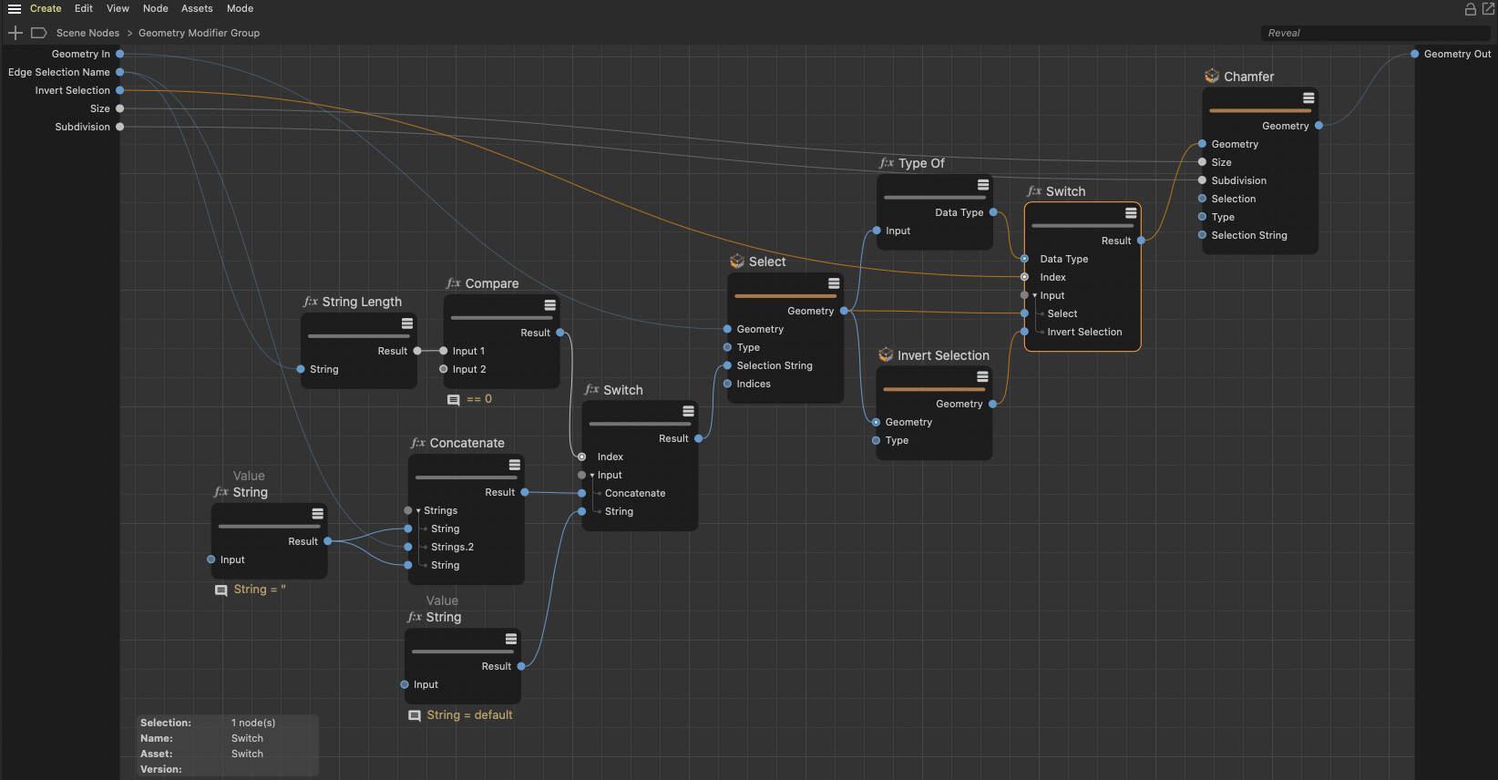 Comme les sélections stockées peuvent être lues directement via une "Chaîne de sélection", mais que celle-ci attend le nom de la sélection entre guillemets, nous devons maintenant compléter l'entrée du nom par des guillemets. Ceci peut être fait très facilement avec un noeud " Concaténer ". En outre, un noeud " Longueur de chaîne " en conjonction avec un noeud " Comparer " peut être utilisé pour vérifier si une entrée pour le nom de la sélection a été faite du tout. Si ce n'est pas le cas, la chaîne par défaut peut être sortie via un nœud " Commutateur ". Cela conduit au fait qu'un nœud " Sélection " sélectionne simplement tout ou revient à la sélection actuellement active. Un nœud " Inverser la sélection " peut alors inverser le résultat.afin de pouvoir choisir entre la sélection normale et inversée, nous ajoutons un nœud " Commutateur " à la fin qui utilise le type de données " Géométrie ". Faites glisser n'importe quelle sortie " Géométrie " vers le nœud " Commutateur " et reliez-la à l'entrée " Type de données ". De cette façon, le signal de la case à cocher "Inverser" peut être utilisé pour commuter la géométrie. Le résultat consiste en une géométrie qui peut être acheminée directement vers le nœud "Biseau". Ainsi, le groupe est déjà fonctionnel.