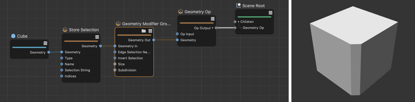Avant de créer une ressource de notre groupe, nous testons la fonctionnalité dans l'éditeur de nœuds. L'utilisation de la chaîne de sélection 0-1 avec un cube sélectionnera l'une de ses arêtes verticales, comme vous pouvez le voir sur le côté droit de l'image.