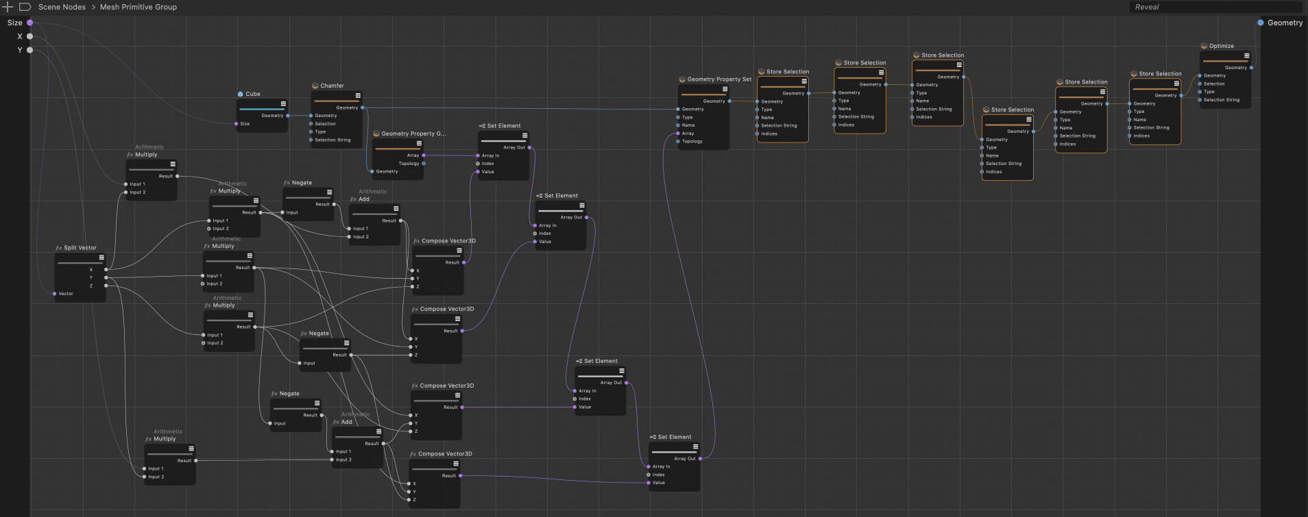Cet exemple utilise une géométrie de cube simple comme base et applique une commande de biseautage à l'une de ses arêtes. Les nouveaux points de cette arête arrondie sont ensuite déplacés par les variables d'entrée de l'utilisateur X et Y. Les positions modifiées des points sont mises à jour dans le tableau des coordonnées des points et sont réécrites à l'aide d'un nœud Géométrie définir les paramètres. Le côté droit de la configuration montre juste la création de sélections pour les polygones et les arêtes, avant qu'une commande Optimiser nettoie tous les points qui partagent la même position.