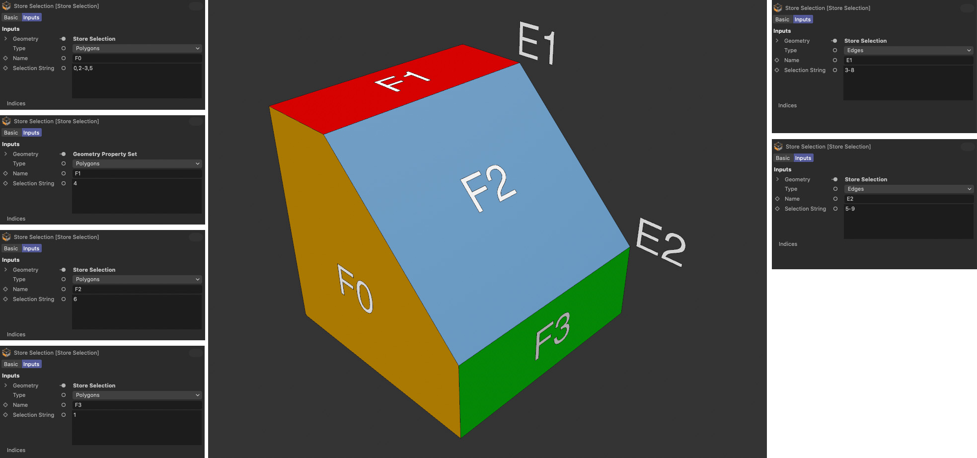 Les images montrent tous les paramètres des nœuds de stocker la sélection et l'endroit où ces sélections peuvent être trouvées dans la géométrie résultante..