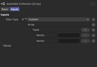 Si des tangentes sont également nécessaires, vous pouvez les créer à partir de deux Vecteurs à l'intérieur d'un Tuple. Le nœud Assembler une collection permet de créer des Tuples et des tableaux de Tuples.