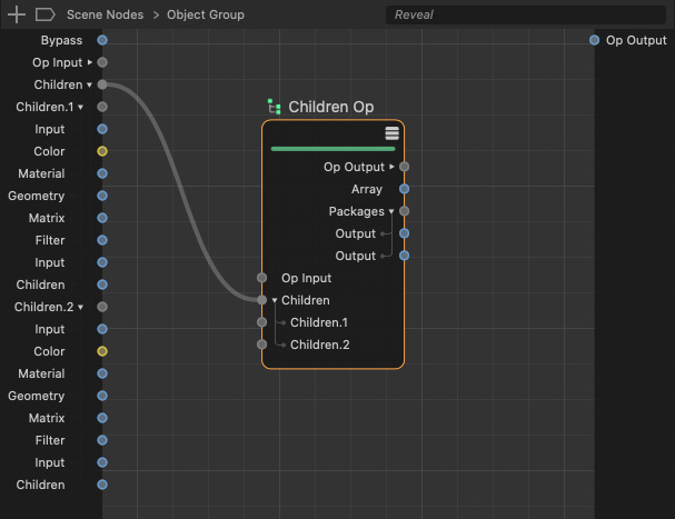 Afin d'accéder aux objets d'un groupe d'objets dans le gestionnaire d'objets, nous devons faire preuve d'un peu de créativité. Nous devons appeler un nœud Op Enfants et connecter son Op Entrée avec l'Op Entrée du groupe, comme le montre l'image ci-dessous. .