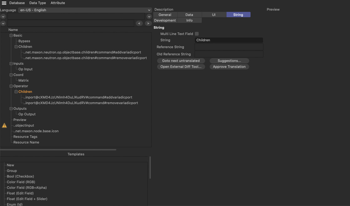 Les nouveaux paramètres ajoutés dans l'éditeur de ressources reçoivent des noms cryptiques par défaut. Utilisez le paramètre Chaîne pour saisir des noms individuels pour vos entrées.