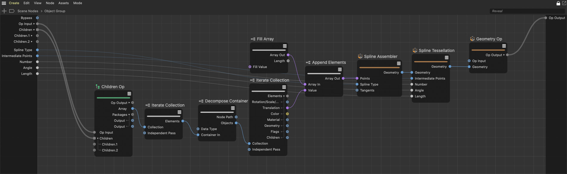 L'utilisation d'un nœud Itérer collection sur tous les objets du groupe Enfant offre des données, telles que les positions que nous utilisons ici pour placer de nouveaux points sur une courbe spline. Les paramètres de la Tesselation de spline sont mis à disposition en tant qu'entrées au niveau du groupe afin que l'utilisateur puisse les modifier ultérieurement directement dans le gestionnaire d'attributs..